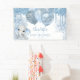 For an elegant Baby Shower. A chic white background. Decorated with faux glitter drips, paint dripping look,glitter dust, blue and silver coloured balloons and a baby elephant. Personalise and add the name. Perfect both as a welcome banner or as party decor.