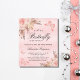For a modern boho style baby shower. A blush pink rustic faux metallic looking background. Decorated with rose gold and pink florals, roses, pampas grass and butterflies. Personalise and add a name and party details.