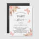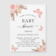 For a modern boho style magnet baby shower invitation. A white background on the front. Decorated with rose gold and pink florals, roses, pampas grass and butterflies. Personalise and add a name and party details.