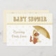 Baby shower invitation in in yellow with cute duck holding umbrella and soft yellow heart and stripe background.