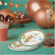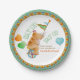 Cute whimsical watercolor unisex animal cycling rhino baby shower paper plates. Add your own honouring name for a cute personalised baby shower party buffet. Soft watercolor brown rhinoceros cycling a unicycle in fall/autumn shades of brown, green, orange, purple and aqua. Personalise with your mother to be name and wording. Unique elephant circus whimsical style watercolor art painting and design by Sarah Trett. www.sarahtrett.com for www.mylittleeden.com