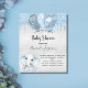 For a baby shower, celebrating a baby boy. A faux silver metallic looking background. Decorated with blue faux glitter drips, paint dripping look, balloons and a cute little baby elephant boy. Personalize and add the name of the mom to-be's name and party details. The name and the text: Baby Shower are written with a hand lettered style script