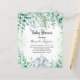 For a baby shower, celebrating a baby boy. A white background. a cute little baby elephant boy and eucalyptus greenery and green sparkles. Personalize and add the name of the mom to-be's name and party details. The name and the text: Baby Shower are written with a hand lettered style script