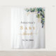 A chic white background. Decorated with green watercolored eucalyptus leaves, sprigs, greenery and a faux gold leaves. Personalise and add the name of the mum to be and a date. Black and golden letters. Can be used as a baby shower welcome banner, as party wall decoration or as a photo booth backdrop.