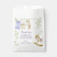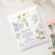 Baby shower Favour Bags feature beautiful watercolor illustrations of cute baby clothes hanging on a line to dry, a cute stuffed bunny, an adorable rocking horse and all of these items are surrounded by delicate branches with light green leaves.