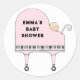 Creative baby shower gift stickers, party favour labels and envelope seals featuring pink baby grand piano stroller and newborn girl.