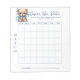 Enhance your baby shower with a custom and personalised guess the date game activity. Guests try to select the correct birthdate. This is a calendar style without the actual numbers shown. Guests can write in the date themselves, or you can opt to include the numbers depending on the desired month. The one who chooses correctly wins a prize. Comes in a notepad style of 40 single side tear-away pages. There is even space for participants to provide their names to refer to later. Teddy Bear Blue Design. Adjust or change the text as needed. Use the template to create your own baby shower guess the date game.
