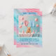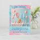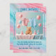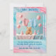 Baby shower invitation card with pink and blue motifs. You can see some baby clothing hanging from a string surrounded by balloons, and a table with some baby items on top. Customisable card.
