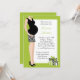 This unisex green baby shower invitation features a pregnant mum to be wearing a black and white zebra print skirt with polka dot gifts.