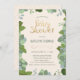 This customisable baby shower invitation features an illustrated border of green, grey and blue flowers with a cream colour background (that can be changed to your liking). The text "Baby Shower" is in a gold, modern script font. The name(s) of the mum-to-be or parents-to-be and event details can be customised for your special event. The back side is a matching cream colour (also changeable) with an overlaying gold quatrefoil pattern.