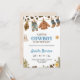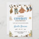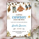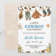 Baby shower invitation with a cowboy theme. Features cartoon cowboy hat, boots, and denim clothes on a clothesline, with text "A Little Cowboy is on the Way!" Decorative cacti and flowers frame the bottom, providing a playful and rustic feel.