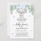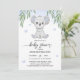 Baby shower invitation decorated with a cute koala illustration and eucolyptus leaves.