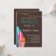 Perfect invitation when the gender of the new baby is unknown. BabyQ invitation with colourful surfboards and little lights strung on top on dark brown background.
