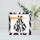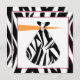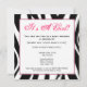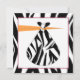 An invitation featuring a black zebra print border on all sides with pink trim around white centre section. Front features an illustration of a stork's beak carrying a zebra print bundle. Personalise with details of your event on opposite side.