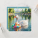 A serene scene features a white duck and a fluffy duckling floating together on a calm river, with the baby duckling inside a colourful inflatable ring.