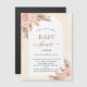 For a modern boho baby shower. An arch frame and rose gold marble print as background. Decorated with rose gold and pink florals, roses and pampas grass. Personalise and add a name and details.
