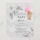 For a modern boho style baby shower. A faux silver looking background. Decorated with non-coloured roses, pampas grass and a teddy bear girl holding a pink balloon. Personalise and add a name and party details.