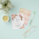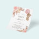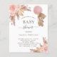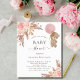 For a modern boho style baby shower. White background on the front. Decorated with rose gold and pink florals, roses, pampas grass and a teddy bear girl holding a pink balloon. Personalise and add a name and party details.