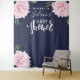Elegant banner with pink peony watercolor florals and navy background. This design features Baby Shower in a hand-lettered font.