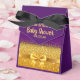 An elegant and glamourous gender neutral baby shower favour box. Chic violet, purple and golden sparkle backdrop with a faux gold ribbon and bow. Template for the mum to be's name, the date of the baby shower and the text: Baby Shower. Golden letters.