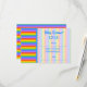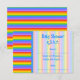 This custom baby shower invitation could be suitable for if the baby is going to be a boy or girl. A stripe pattern in rainbow colours, with pale stripes behind the writing. The text is in blue and can be personalised to create a custom invitation. A fun bright and colourful design.