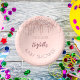 A rose gold background, decorated with rose gold glitter drips, paint dripping look. The text: The name is written in dark rose gold with a large modern hand lettered style script. Personalise and add a date, name.