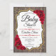 Baby Shower Invitation. Rustic design with wood pattern and faux glitter gold. Features trendy script font, red roses and confetti. Perfect for a stylish gender neutral baby shower.