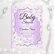 Baby Shower Invitation. Elegant design in purple, silver and white. Features trendy script font, white roses, faux glitter silver and confetti. Perfect for a stylish Baby Shower. Customise with your own details.