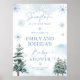 Baby shower blue winter wonderland welcome sign with snowflakes and pine trees.