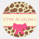A baby shower sticker featuring a giraffe print design across top and bottom. Pink bow, trim, and text that reads "It's a Girl!" Matching invitations, postage, and address labels available for purchase in the "Baby" category of Jill's Paperie.
