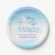 Cute baby shower stork delivering a baby boy paper party plates. Ideal for a special baby boy showering party or event. Personalise with your mother to be name and wording. Currently reads A baby boy is on his way dig in and honour mother-to-be Danielle MacDonald. Original watercolor whimsical art and design by Sarah Trett for www.mylittleeden.com