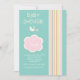 This cute, teal background shower invitation, with a border of pastel-coloured stripes, features a stork and a pink cloud for a name or date.