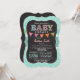 Neutral baby shower invitation with cute chalkboard look font on teal circles pattern. Vintage feel chalk fonts on cool blackboard background with colourful pink, orange, purple, and green bunting flags.