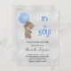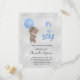 For a baby shower celebrating a baby boy. A faux silver looking background. A teddy bear holding a blue balloon. Personalise and add the name of the mum to-be and party details. The name and the text: It's a Boy! are written with a hand lettered style script.