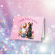 Thank you cards for a baby shower. Sweet baby girl sitting next to her little puppy German Shepherd in a patch of pretty watercolor flowers. Pink and blue butterflies and pretty wildflowers.