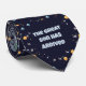 Celebrating a baby shower, a father wears a whimsical tie adorned with stars and planets, embracing his new role with joy.