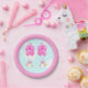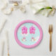 Creative baby shower plates featuring sweet twin girls and pink balloons.
