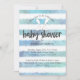 Cute blue and white stripe, background to celebrate a baby boy themed baby shower. A white rabbit appears just above "Baby Shower" text. Edit text areas to create a unique and special baby shower party.