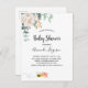 For a Baby Shower, gender neutral. A chic white background. Decorated with a white watercolored rose, flower, floral and green eucalyptus greenery, leaves, a golden sprig, and a cute happy smiling bee carrying an envelope. Personalise and add a name and party details. Black letters. The text: Baby Shower and the name of the mum to bee are written with a modern hand lettered style script.