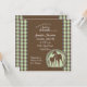 This baby shower invitation with horses is design with green and brown plaid. The horses stand in front of the horseshoe shape made with smaller plaid. This makes a great invitation for anyone who loves horses.