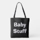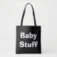 This diaper bag says 'Baby Stuff' in white letters on a black tote bag that's suitable for mum or dad.
