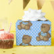 Cute brown teddy bear with blue bib on polka dots for baby boy gift
