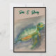 Watercolor painting of a baby turtle swimming along. Beautiful teals, blue and greens create a soothing sweet rendition of a baby turtle moving through the waters. A cute design appropriate for gift items for baby or for home decor, notecards and tote bags.
