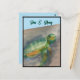 Watercolor painting of a baby turtle swimming along. Beautiful teals, blue and greens create a soothing sweet rendition of a baby turtle moving through the waters. A cute design appropriate for gift items for baby or for home decor, notecards and tote bags.