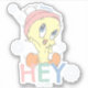 This delightful graphic showcases Tweety Bird in a cute winter setting, making it a charming addition to any Looney Tunes collection. Tweety, donning a snug pink beanie, is illustrated in a soft, pastel colour palette that complements the snowy theme. His wide-eyed, curious expression, coupled with the playful "HEY" in multi-coloured letters, captures the innocence and mischievous charm of this beloved character. Snowflakes gently drift around him, adding to the whimsical, chilly atmosphere of the scene. This graphic is perfect for spreading a light-hearted, joyful vibe during the winter season or as a sweet decoration in a child's room.