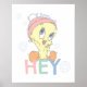 This delightful graphic showcases Tweety Bird in a cute winter setting, making it a charming addition to any Looney Tunes collection. Tweety, donning a snug pink beanie, is illustrated in a soft, pastel colour palette that complements the snowy theme. His wide-eyed, curious expression, coupled with the playful "HEY" in multi-coloured letters, captures the innocence and mischievous charm of this beloved character. Snowflakes gently drift around him, adding to the whimsical, chilly atmosphere of the scene. This graphic is perfect for spreading a light-hearted, joyful vibe during the winter season or as a sweet decoration in a child's room.