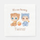 Cute cartoon babies in animal rompers. The one on the left is dressed in a brown bear jumpsuit with a yellow bib with a tiny bee. The one on the right is dressed as a grey cat and holding a baby rattle shaped like a cat’s bell. Bright ball is resting between them.