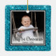 This lovely Baby's 1st Christmas photo ornament with an aqua glitter edge, the words "My 1st Christmas", your child's name and the year will look beautiful on your tree. You'll cherish it and enjoy taking it our every year to put on your tree.