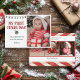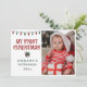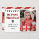 Celebrate your baby's very first Christmas with this charming holiday photo card, featuring bold red text, playful Christmas graphics, and room for your favourite festive baby photo on the front. The design includes a cheerful string of lights, candy cane gift illustration, and a personalised name section for your little one's special milestone. The back of the card continues the sweet holiday theme with candy cane borders and space for three adorable photos, along with a warm holiday message and a personal signature line. A perfect keepsake for family and friends to treasure!