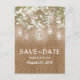 Save the date postcards featuring a rustic brown burlap effect background, elegant mason jar string lights, baby breath flowers and white wording.